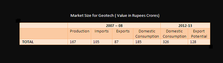 Current Geotextiles Market in India (Imports and domestic production) is around Rs 272 Crore, comprising imports of an estimated Rs 105 Crore and domestic production of around Rs 167 Crore. In terms of product category, the market includes Rs 241 Crore of synthetic woven/non-woven Geotextiles (85 Crore of woven and 67 Crore of Non-woven) as well as other products like Geogrids and Others (Geomembranes, Geonets and Geocomposites). Agro-based Geotextiles (made of Jute and Coir) are also developing and finding acceptance as a class of products. Market size for these products was around Rs 31 Crore.